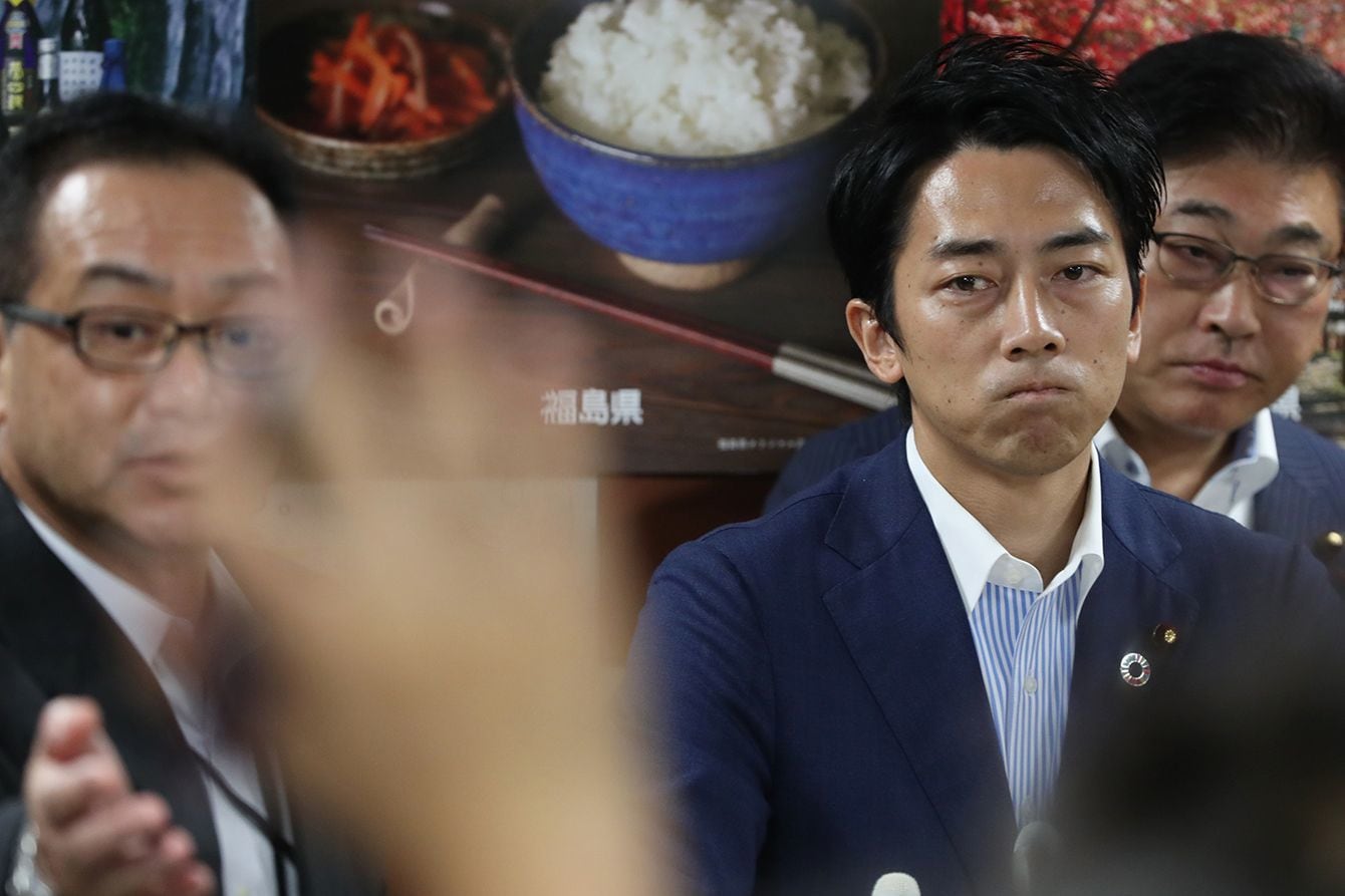 福島県の内堀雅雄知事と会談後、取材を受ける小泉進次郎環境相(右から2人目)=2019年9月12日、福島県庁