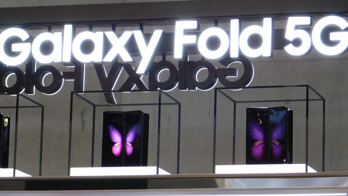 サムスン電子が家電見本市「IFA」で報道陣向けに公開した折り畳み式スマートフォン「ギャラクシー・フォールド」=2019年9月5日、ドイツ・ベルリン