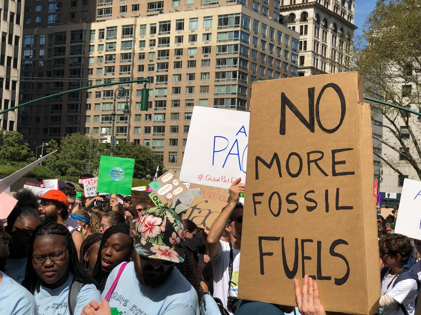 「化石燃料をやめろ」と書かれたプラカードを掲げるデモ参加者