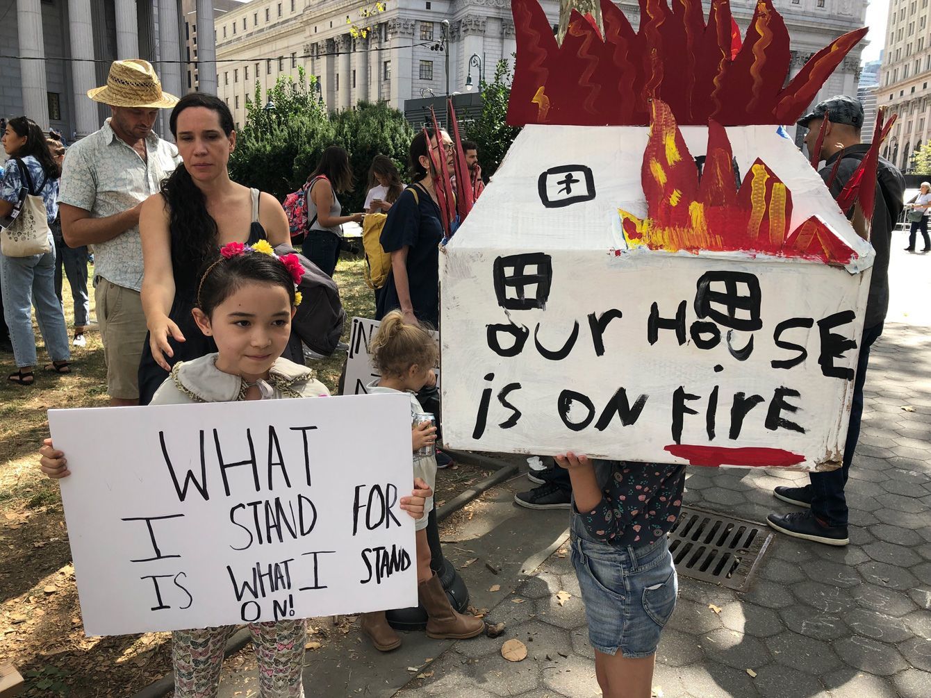 「私たちの家が燃えている」と書かれたプラカードを持つ参加者(右)。デモには未成年も多く参加した