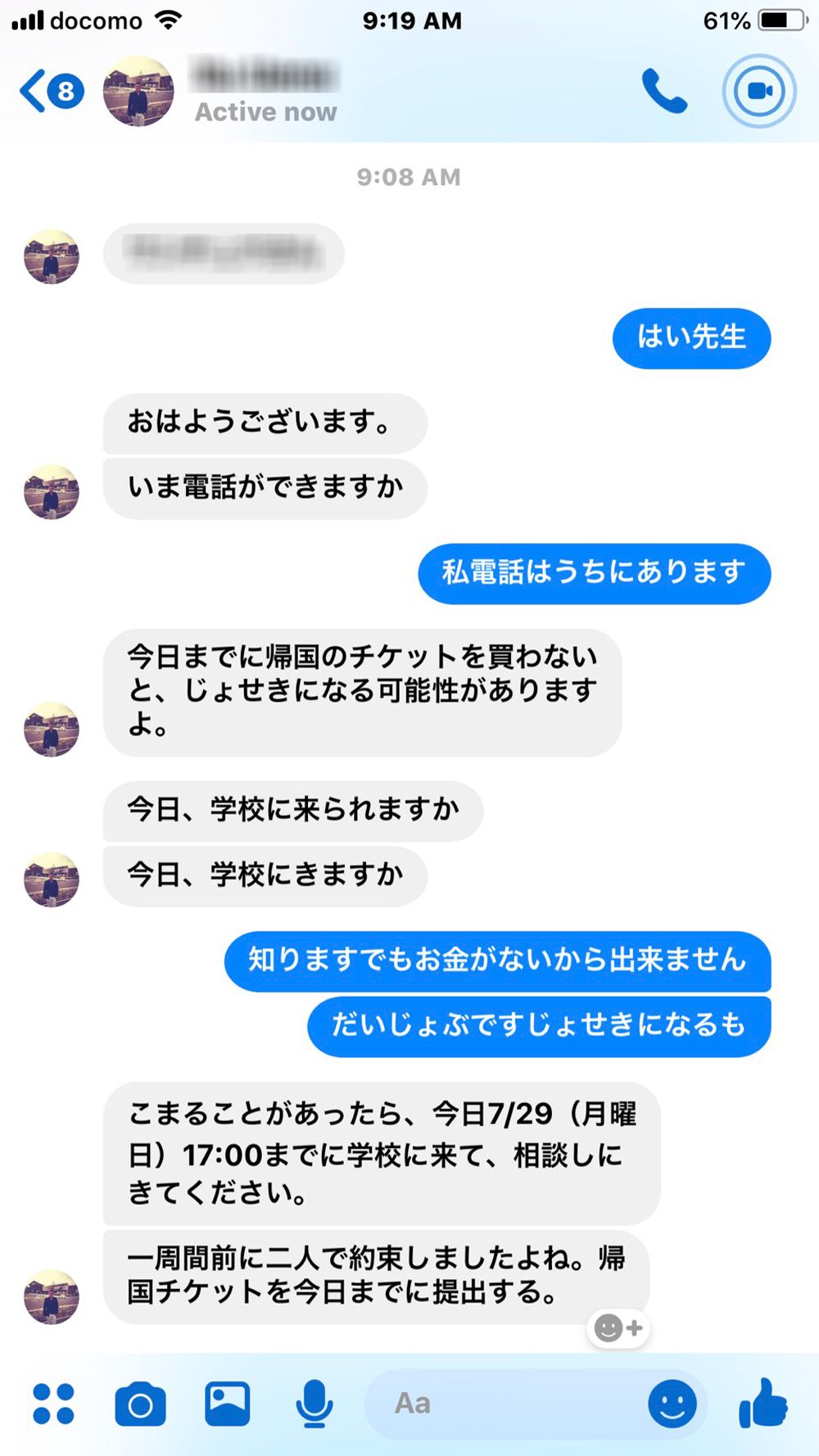ダワ君と学校担当者とのメッセージのやりとり