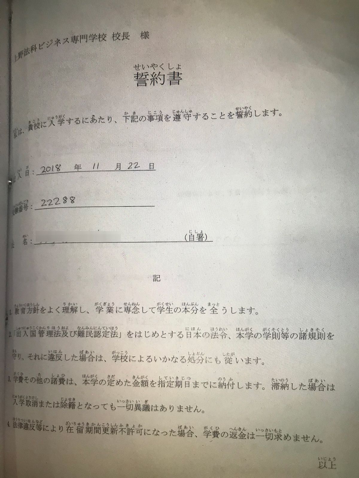 入学前にダワ君が署名した「誓約書」