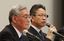記者会見する関西電力の岩根茂樹社長(右)と八木誠会長=2019年10月2日、大阪市福島区