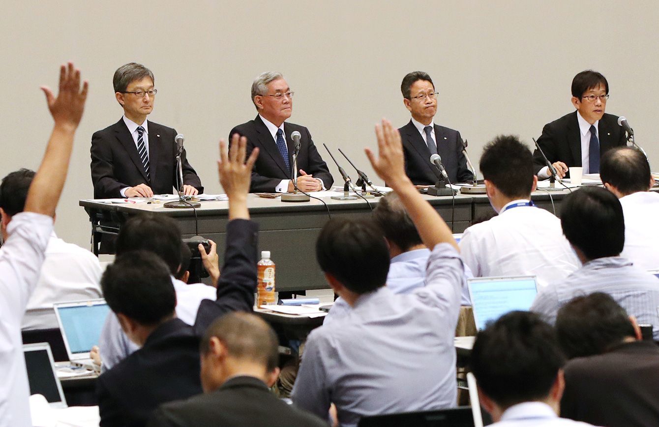 記者会見で質問を受ける関西電力の八木誠会長(左から2人目)と岩根茂樹社長(同3人目)ら=2019年10月2日、大阪市福島区