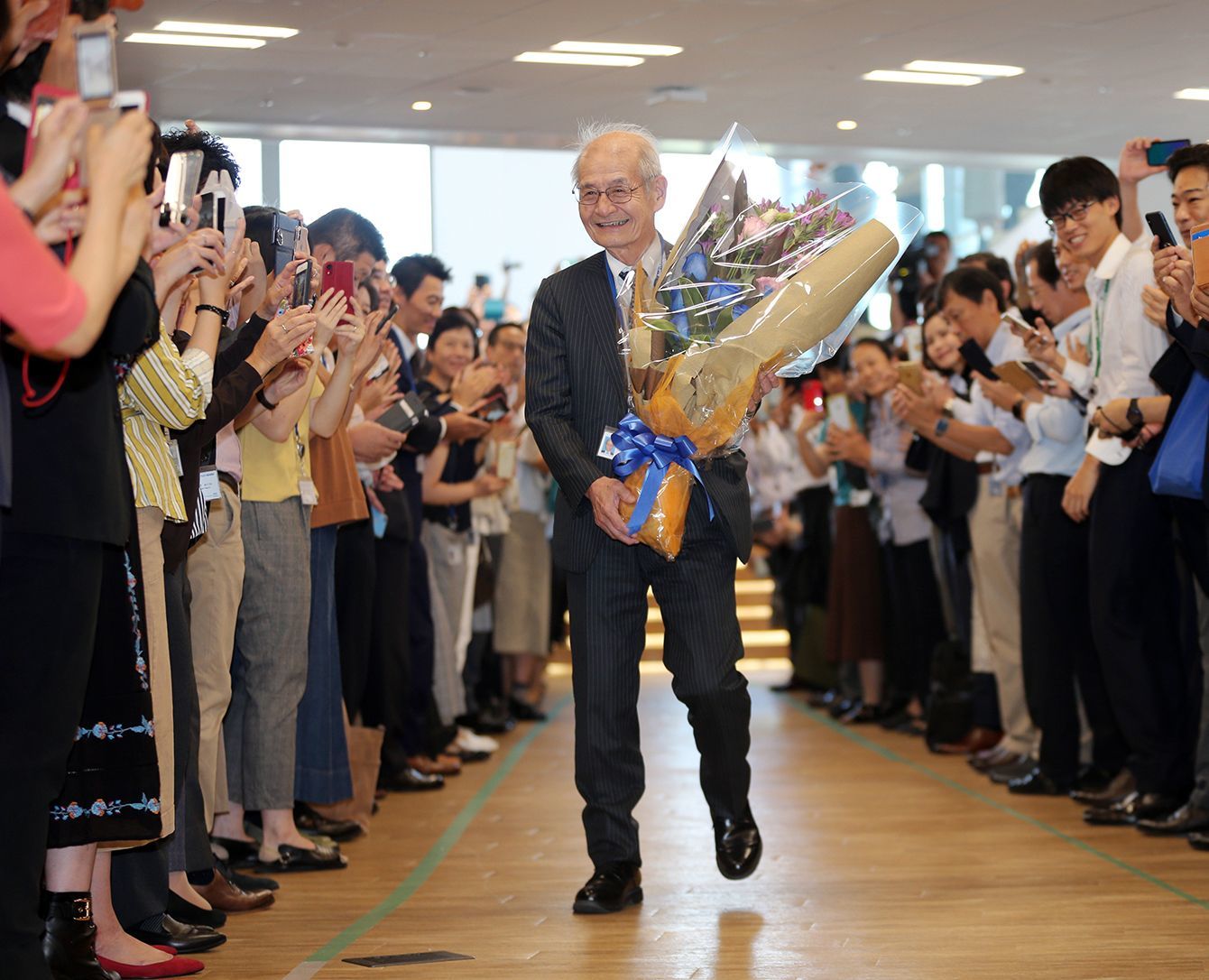 ノーベル化学賞の受賞決定から一夜明け、旭化成の社員らから祝福される吉野彰氏=2019年10月10日午前、東京都千代田区