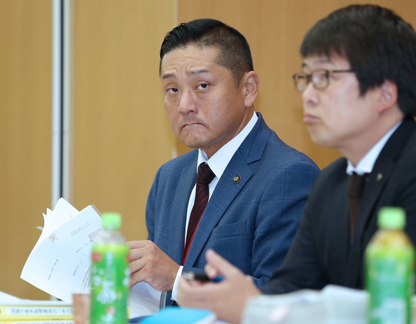 意見陳述のため、国の第三者機関「国地方係争処理委員会」に出席した大阪府泉佐野市の千代松大耕市長(左)=2019年7月24日、東京・霞が関の総務省