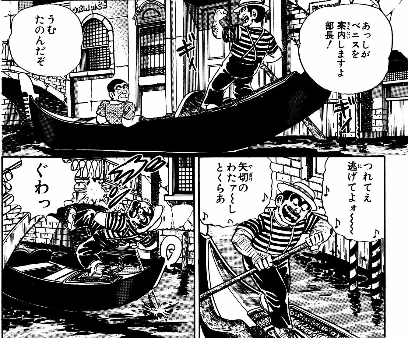 東京・下町をはじめ精緻な背景も魅力。上は水の都・ベニスを舞台にした回。イタリア人に扮した両さんがゴンドラに部長を乗せて遊覧した(46巻「ゴンドラのうたの巻」)