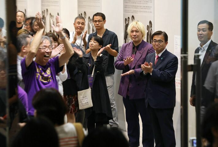 国際芸術祭「あいちトリエンナーレ2019」の最終日を終え、拍手する芸術監督の津田大介氏(右から3人目)と大村秀章愛知県知事(同2人目)ら=2019年10月14日、名古屋市東区