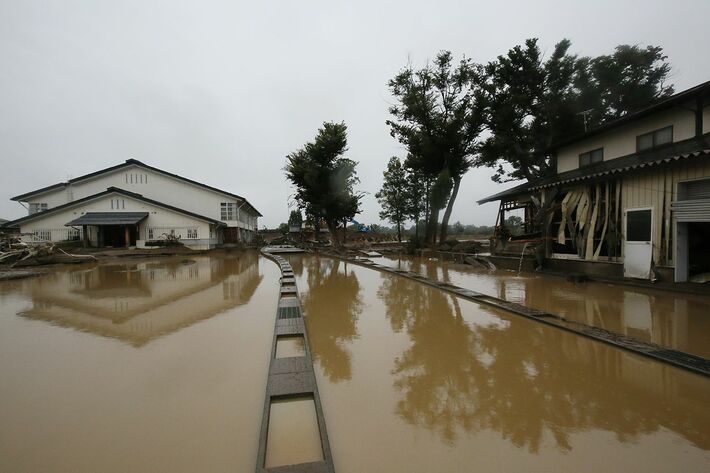 側溝だけが残された千曲川堤防の決壊箇所付近の道路=2019年10月14日午後、長野市の穂保地区