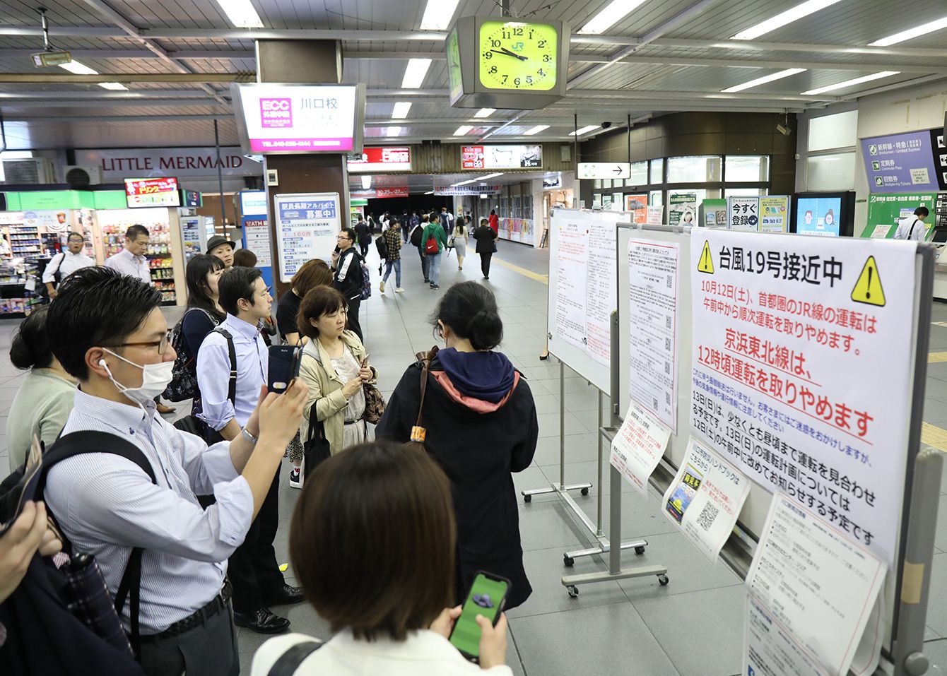 台風19号の接近に伴い、掲示された運休情報などを見る人たち=2019年10月11日、埼玉県川口市のJR川口駅