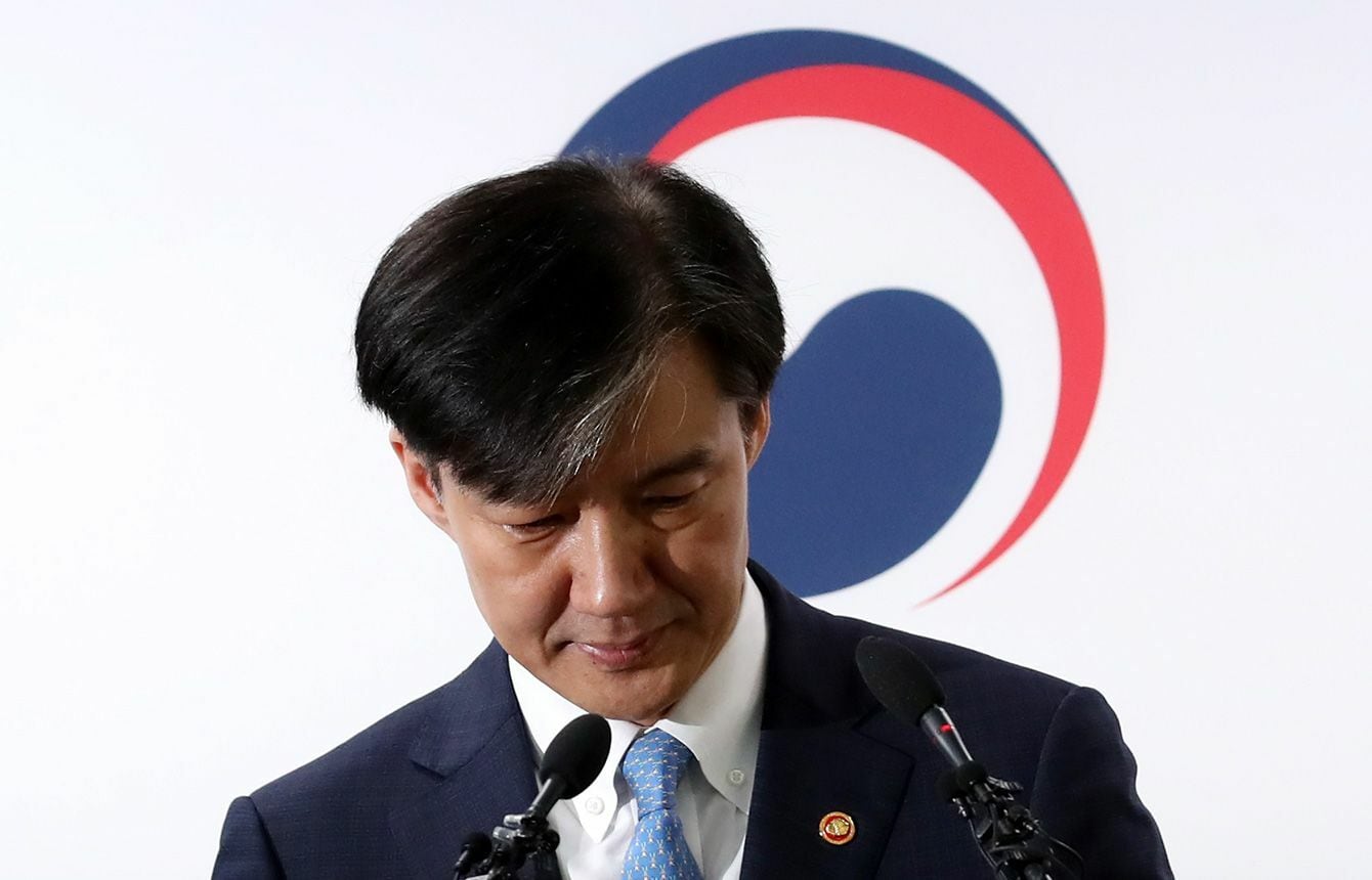 10月14日、ソウル近郊の法務省庁舎で発言する韓国のチョ・グク法相(韓国)