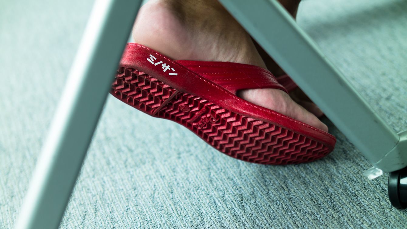 箕輪厚介氏プロデュースの「ミノサン」。「ギョサン」と同じメーカー製で、丈夫で滑りにくい。写真は箕輪編集室メンバー還暦祭限定モデルの赤。そのほか、青・白・黒(税込100円)・黄(税込13万円)がある