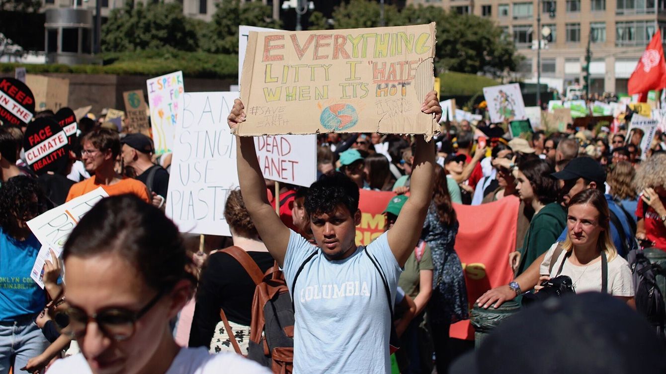 「私たちの家が燃えている」と書かれたプラカードを持つ参加者(右)