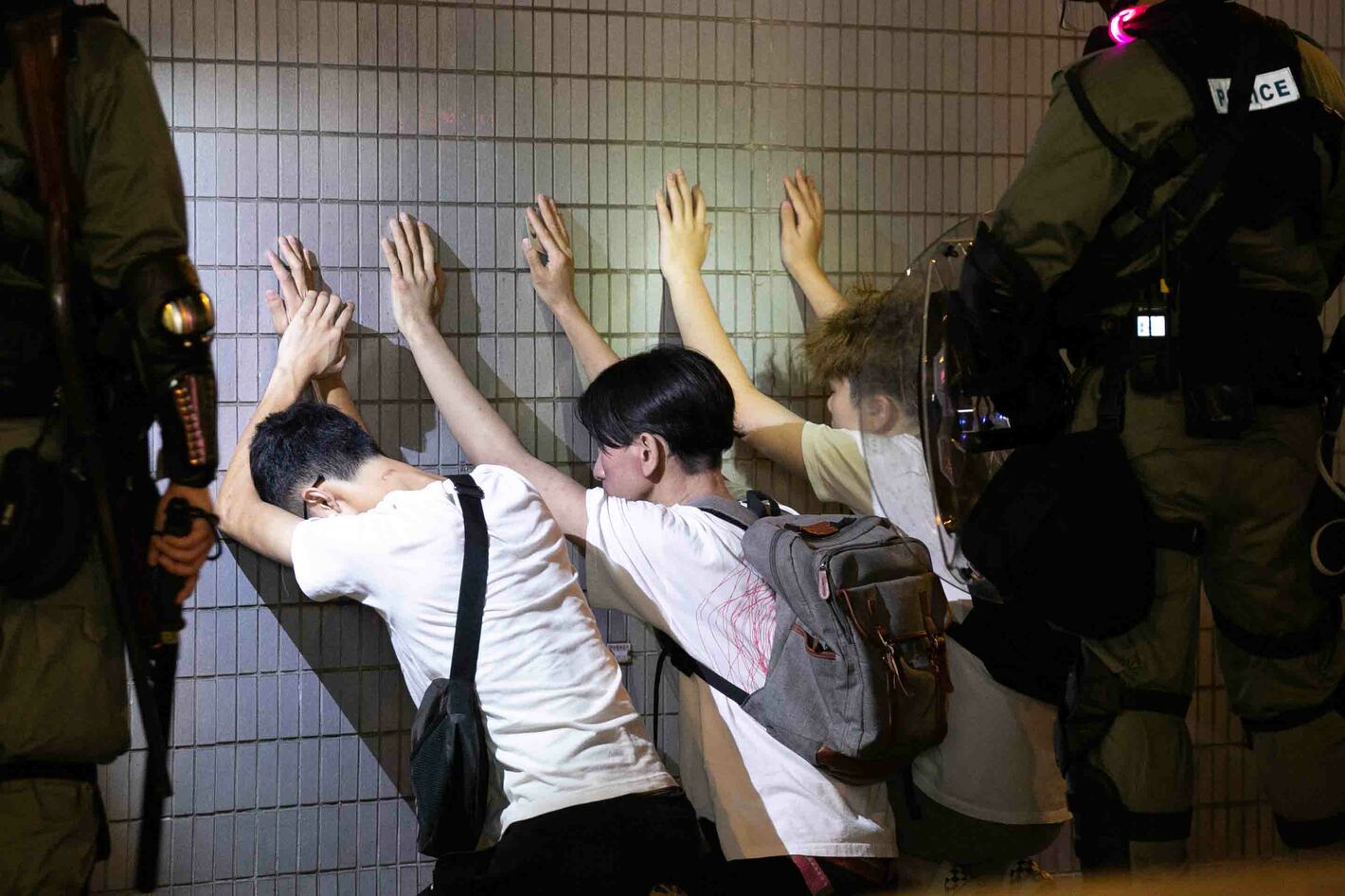 9月21日22:18 香港 元朗(ユンロン)。拘束され取り調べを受けるデモ参加者。