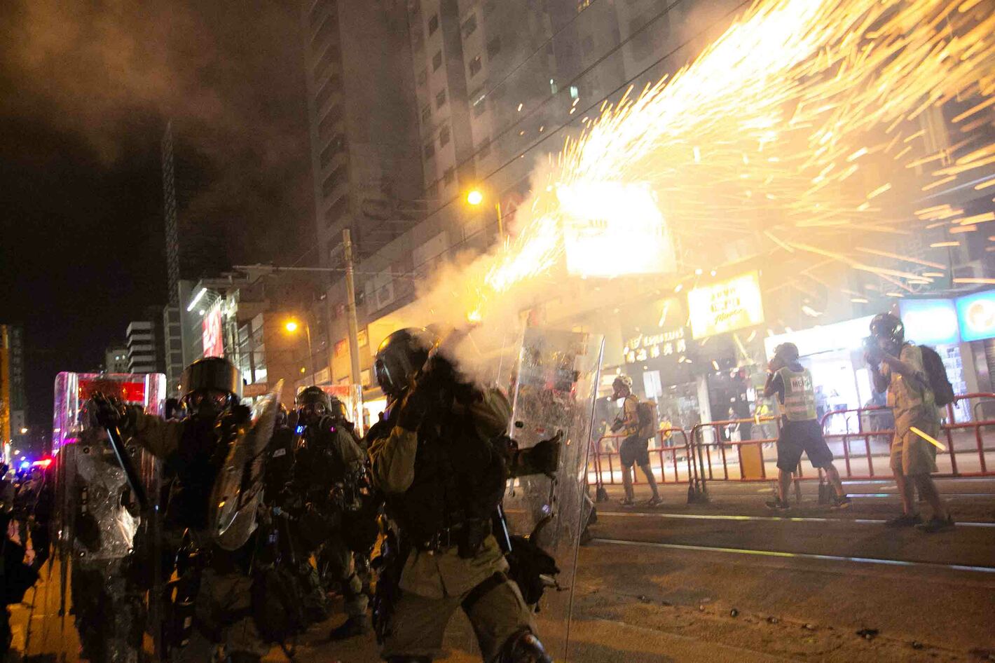 9月21日23:15 香港 元朗(ユンロン)。警告の後、デモ隊に向け催涙弾を放つ警官隊。