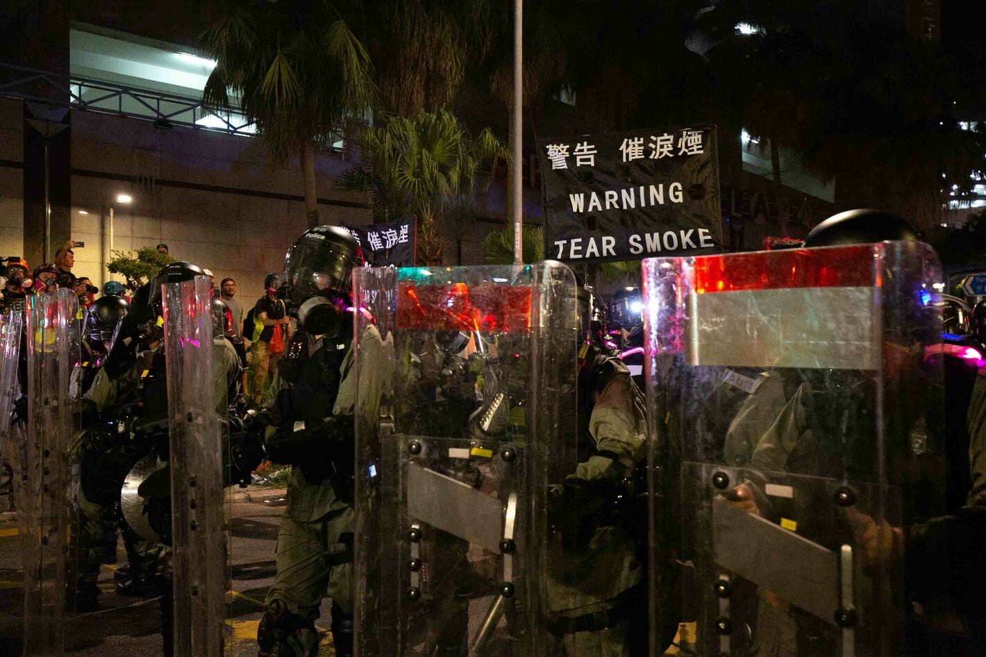 9月21日23:07 香港 元朗(ユンロン)。ガスマスクを装着し、催涙弾の使用を警告する警官隊。