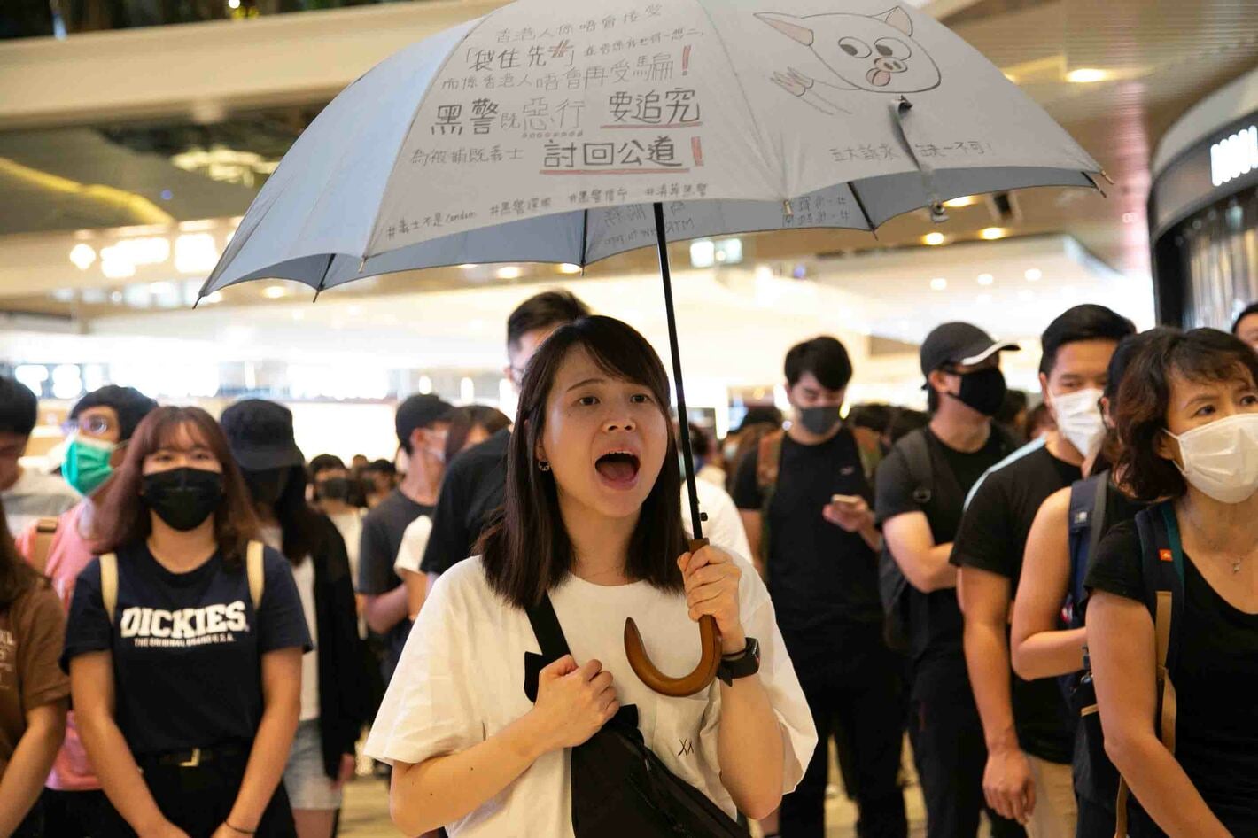 9月21日20:39 香港 元朗(ユンロン)駅直結のショッピングモール。シュプレヒコールを叫ぶ女性。雨傘革命にちなむ傘には「警察の悪行を追求する必要がある。正義を求めて」という意味の言葉が書いてあった。