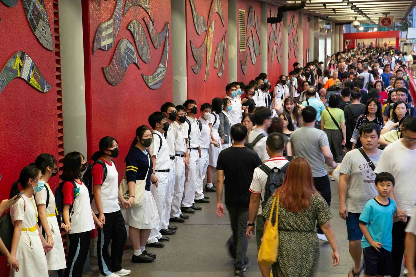9月20日16:23 香港 荃湾(チュンワン)駅。学生たちによる「人間の鎖」。約1kmにわたって手を繋いだ学生が駅を取り囲んだ。