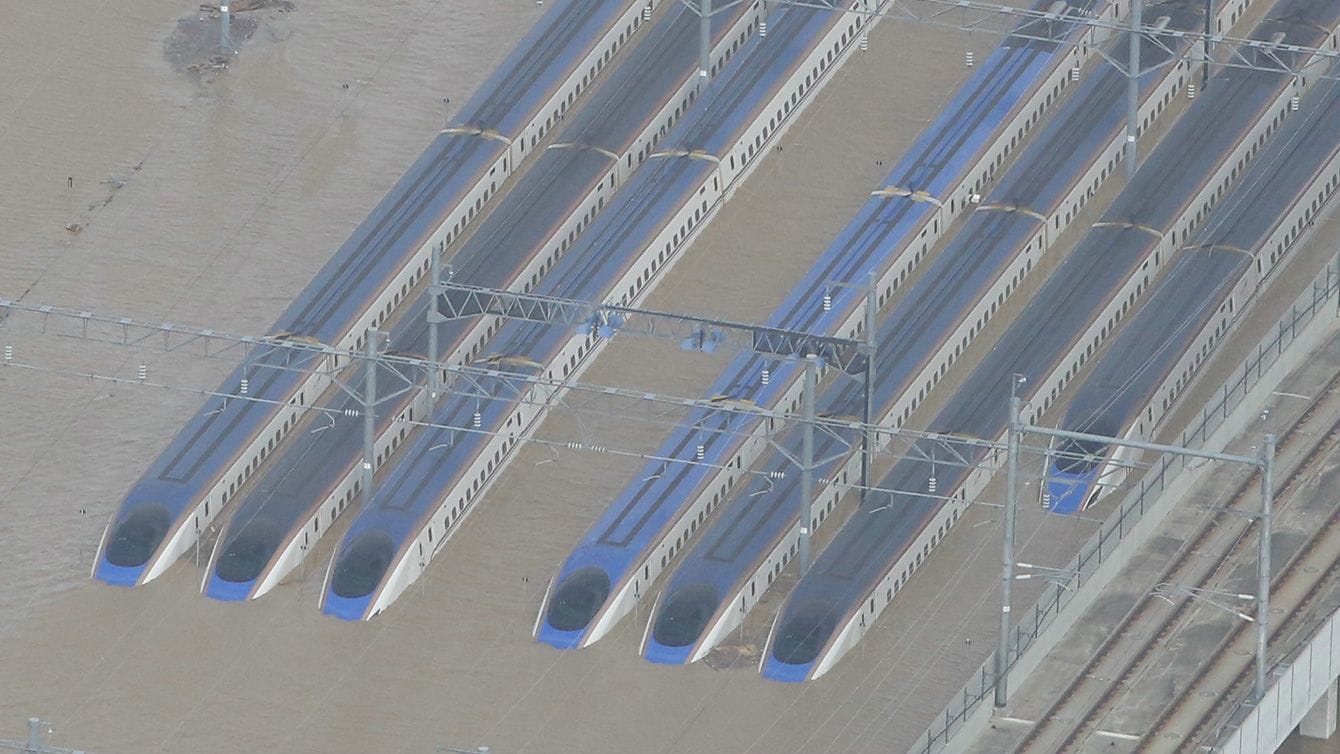 台風19号の大雨で千曲川が氾濫し、水につかった北陸新幹線の車両=2019年10月13日、長野市