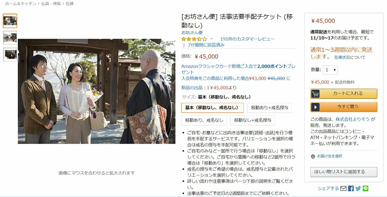 アマゾンに出品していた[お坊さん便]のページ(10月23日14時)