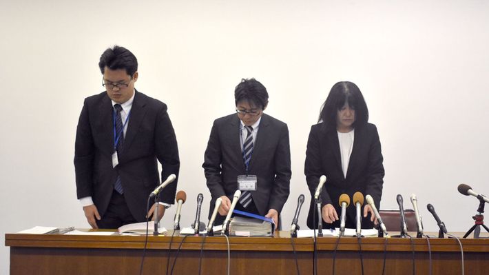 記者会見で謝罪する神戸市立東須磨小学校の仁王美貴校長(右端)ら=2019年10月9日、神戸市役所