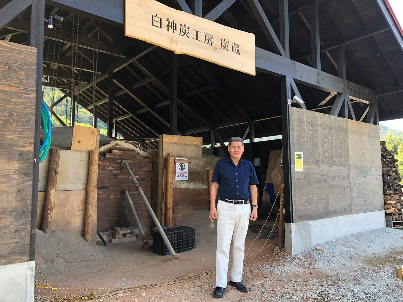 成田専蔵社長。小屋ではリンゴの剪定枝を使ってコーヒーの炭焼き焙煎を行っている。