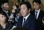 安倍晋三首相に辞表提出後、記者団の質問に答える菅原一秀経済産業相(中央)=2019年10月25日、国会内