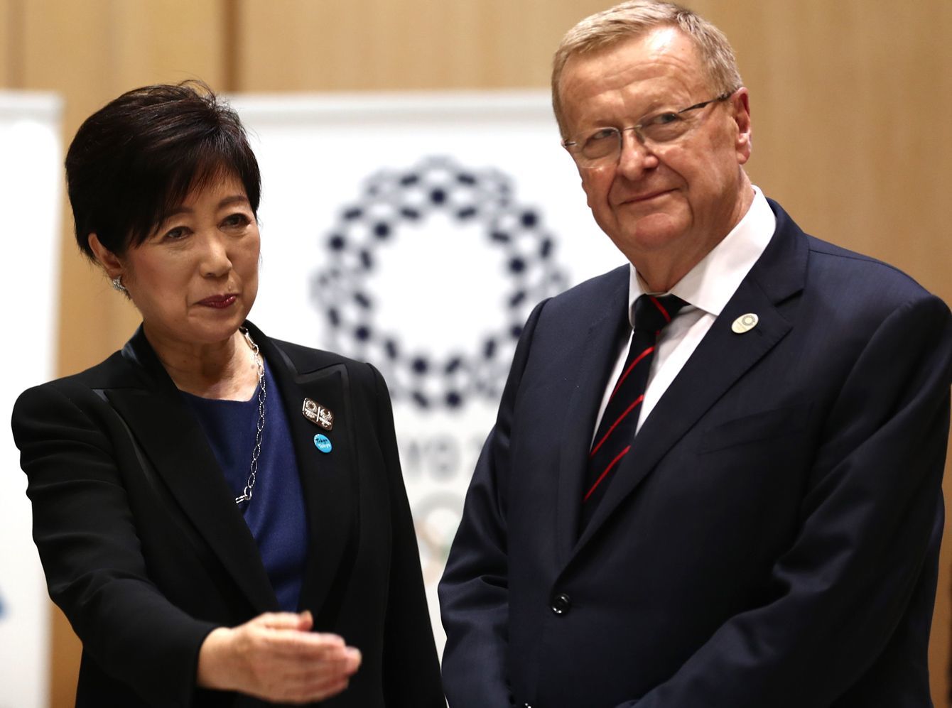 小池百合子東京都知事(左)と、2020年夏季オリンピック・パラリンピックIOC調整委員会委員長のジョン・コーツ氏。都知事は、猛暑対策として、マラソンと競歩の開催地を札幌に移す案について、「青天の霹靂だ」と表現した(2019年10月25日、東京都)