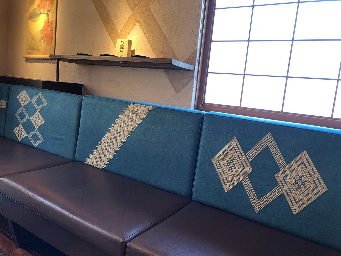 津軽地方の伝統工芸「こぎん刺し」があしらわれたソファ