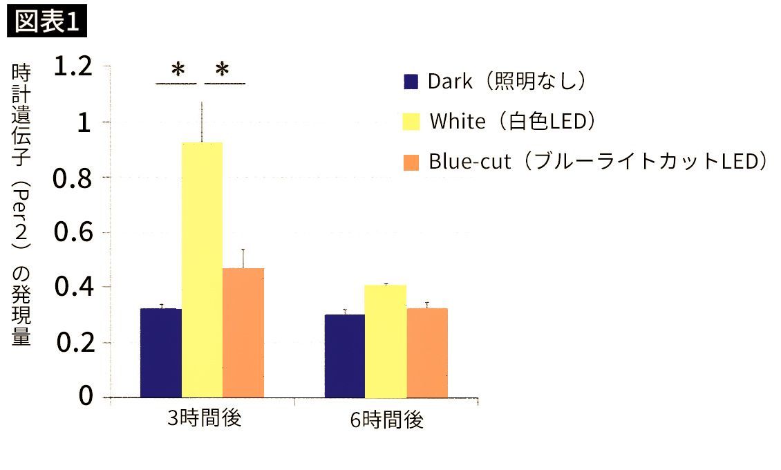 ブルーライトカットしたLEDは、白色LEDと比較して体内時計中枢(脳・視交叉上核)における時計遺伝子Per2発現量を抑える(※)。