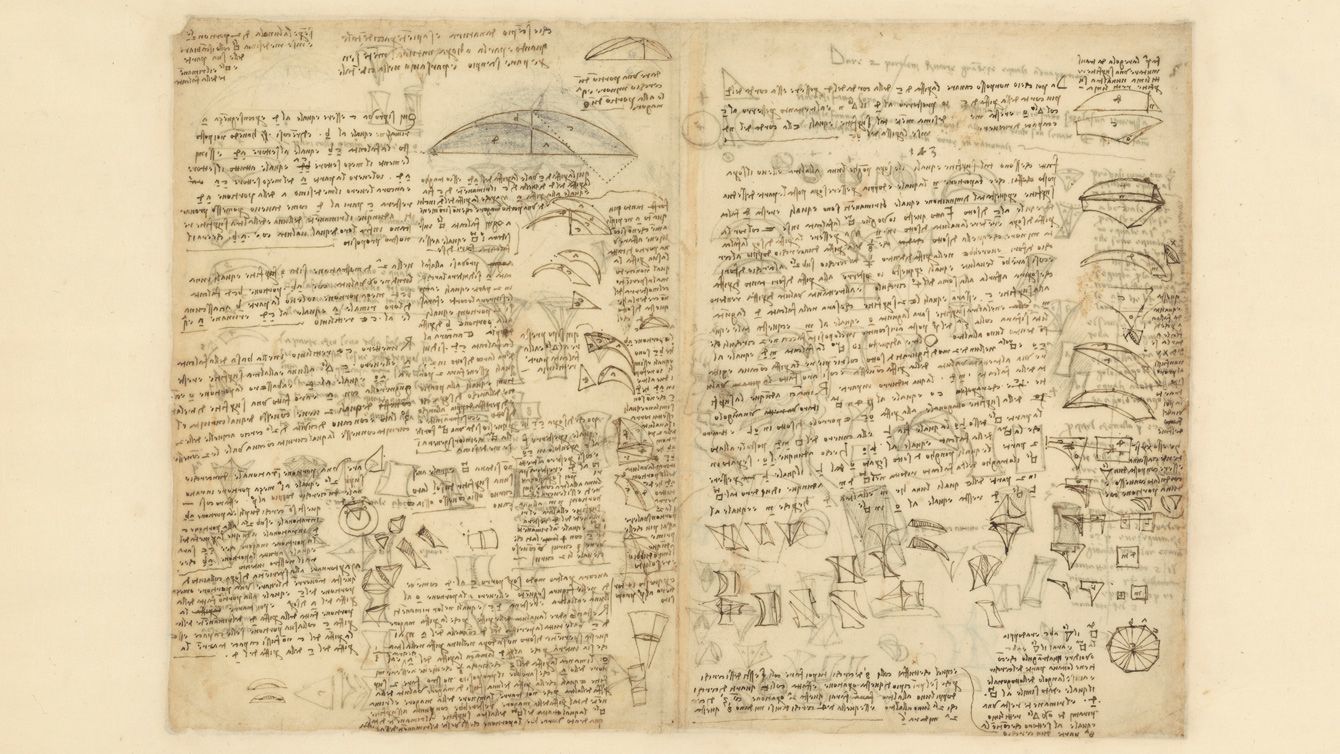 ルネサンスの「万能の天才」、レオナルド・ダ・ヴィンチが残した膨大なノートの一つ、「アトランティコ手稿」の一部。左右が逆転した鏡文字で書かれている。ミラノ・アンブロジアーナ図書館蔵。