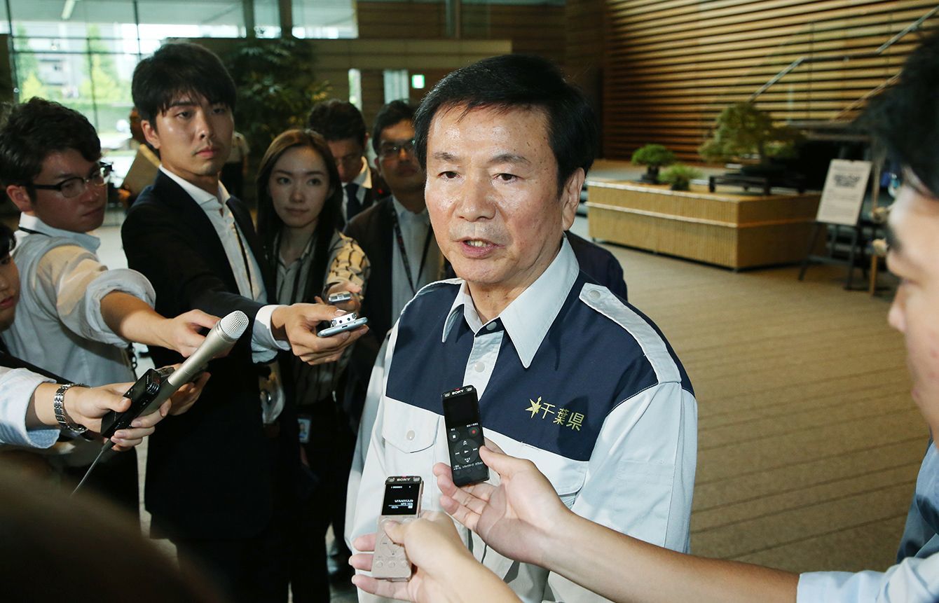 安倍晋三首相との面談後、報道陣の質問に答える千葉県の森田健作知事=2019年9月18日、首相官邸