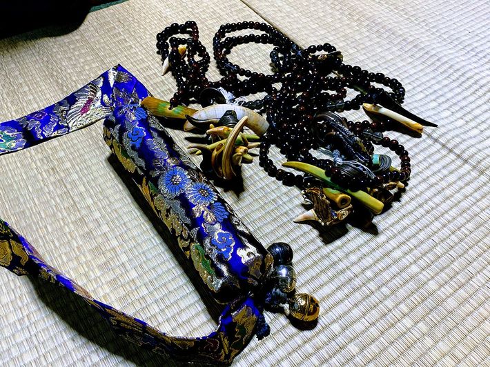 イタコの証しである神札「オダイジ」と、クマやシカの爪などでつくられた「数珠」