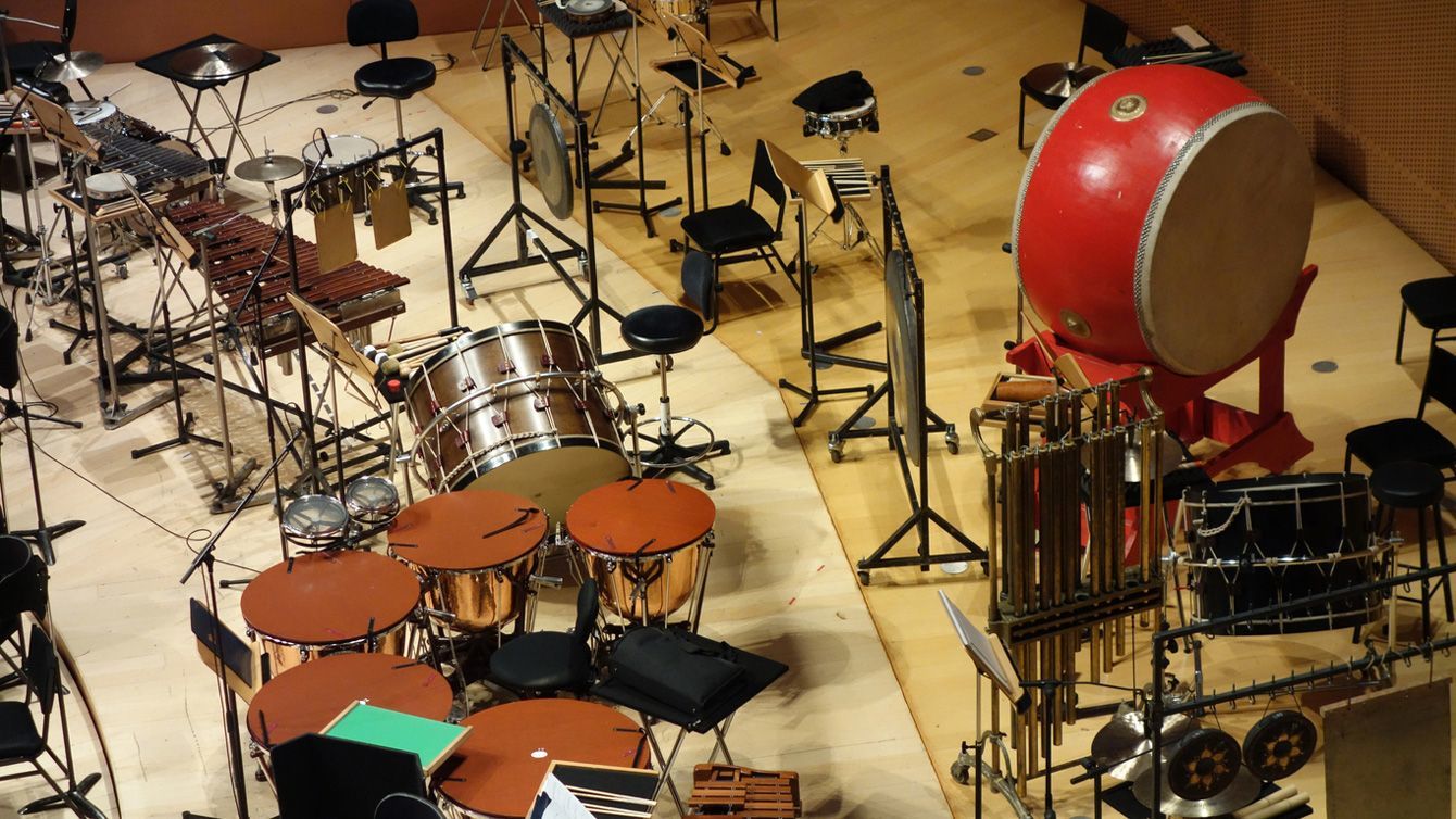 オーケストラ後方の打楽器奏者席付近。太鼓系から木琴系まで、多様な楽器がずらりと並ぶ。(※写真はイメージです)