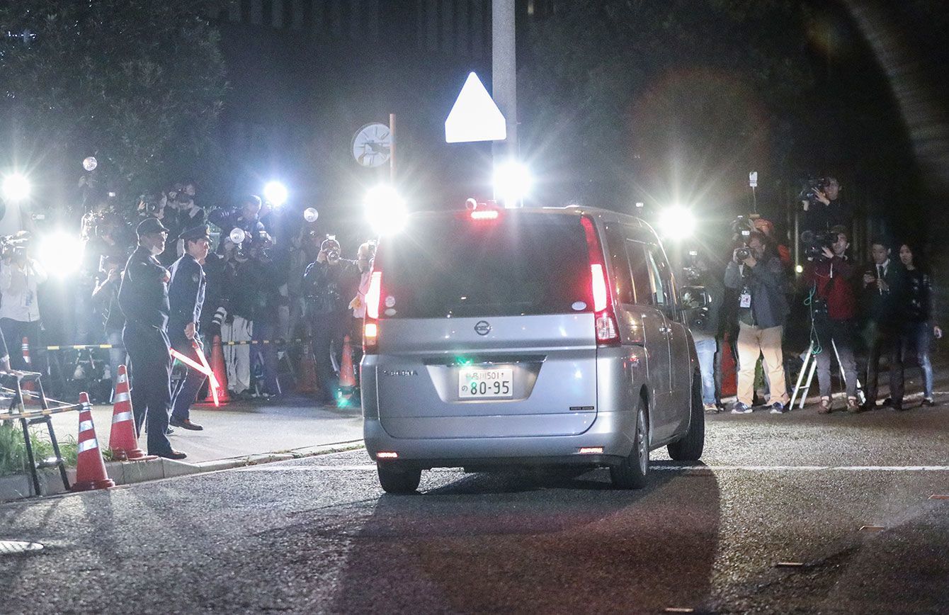 多数の報道陣が待ち構える中、警視庁東京湾岸署に入る女優の沢尻エリカ容疑者を乗せた車=2019年11月16日、東京都江東区
