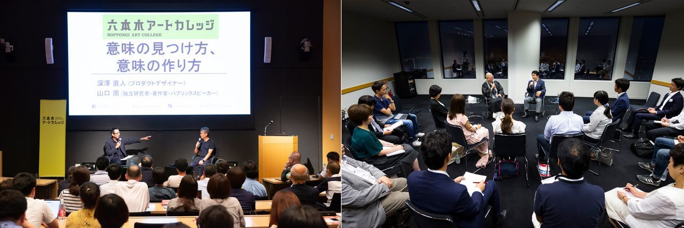 (写真左)今年の六本木アートカレッジの第1回セミナーはシリーズディレクターの山口周氏とプロダクトデザイナーの深澤直人氏が登壇。/(写真右)定員30人のインタラクティブセッションが人気の未来自分会議シリーズ。