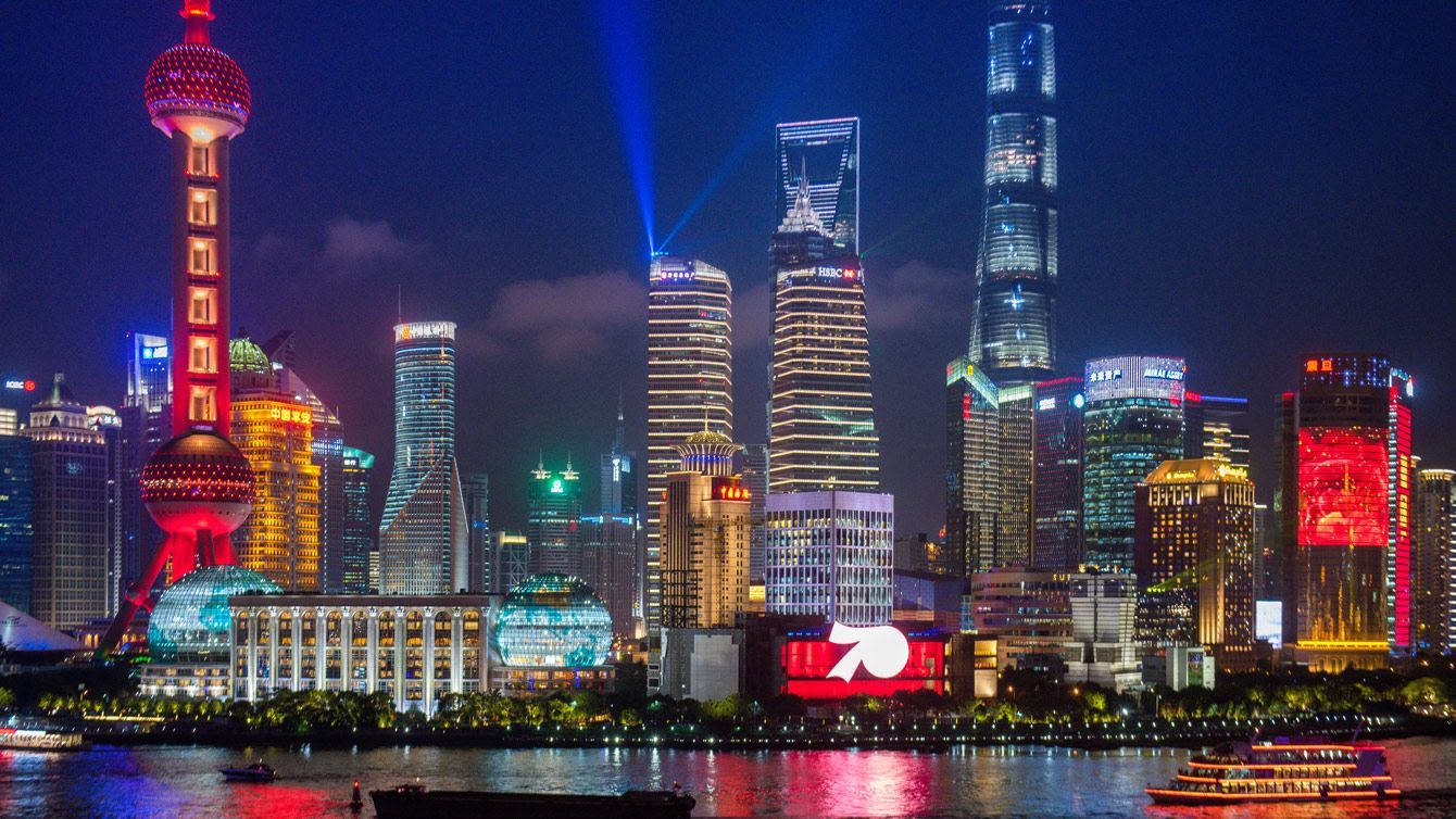 建国70周年を記念し、グランドライトショーが行われた上海=2019年10月6日