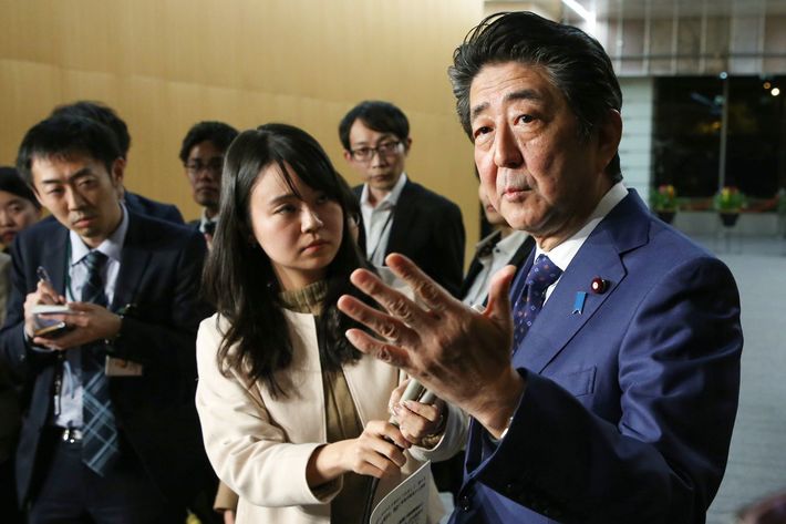 記者団の質問に答える安倍晋三首相(右)=2019年11月15日夜、首相官邸