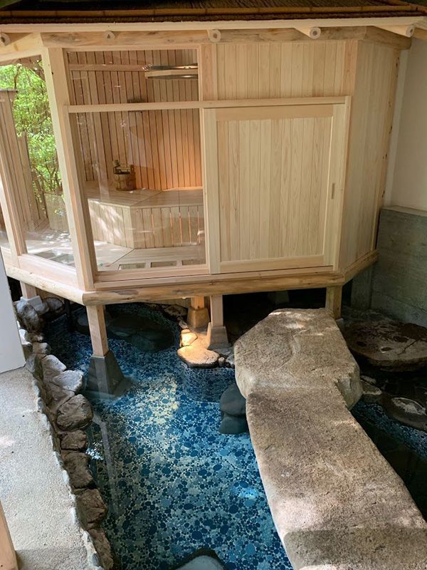先日筆者がプロデュースを手がけたホテル「おちあいろう」のサウナ。茶室のようなサウナが水風呂の上に佇む。