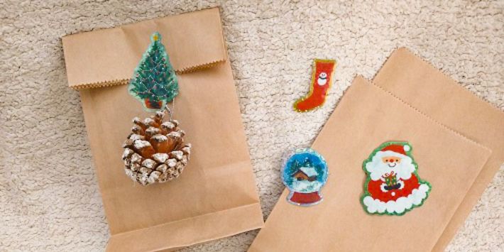 無地の封筒でも、松ぼっくりのオーナメントをクリスマス柄シールで貼ればパーティー仕様になる