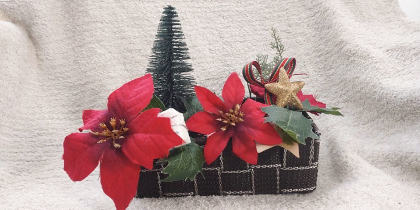 カゴにミニサイズのツリーを入れて、ポインセチアの造花を手前に載せただけ。総額300円(税別)