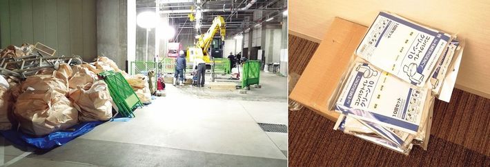 復旧作業中の地下2階(左)。各階に設置された簡易式トイレ(右)。(ともに情報提供者撮影)