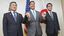 日米韓防衛相会談を前に手をつなぐ(左から)韓国の鄭景斗国防相、マーク・エスパー米国防長官、河野太郎防衛相=2019年11月17日、タイ・バンコク