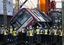 京浜急行線の踏切でトラックと衝突し、脱線した車両の撤去作業=2019年9月6日、横浜市神奈川区