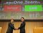 経営統合に関する共同記者会見で握手するヤフー親会社Zホールディングス(HD)の川辺健太郎社長(左)とLINEの出沢剛社長=2019年11月18日、東京都港区