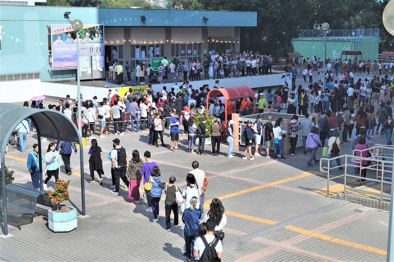 区議会選挙の投票所となった新界地区・沙田の公民館(奥)周辺で、長蛇の列をつくる香港の有権者=2019年11月24日、香港