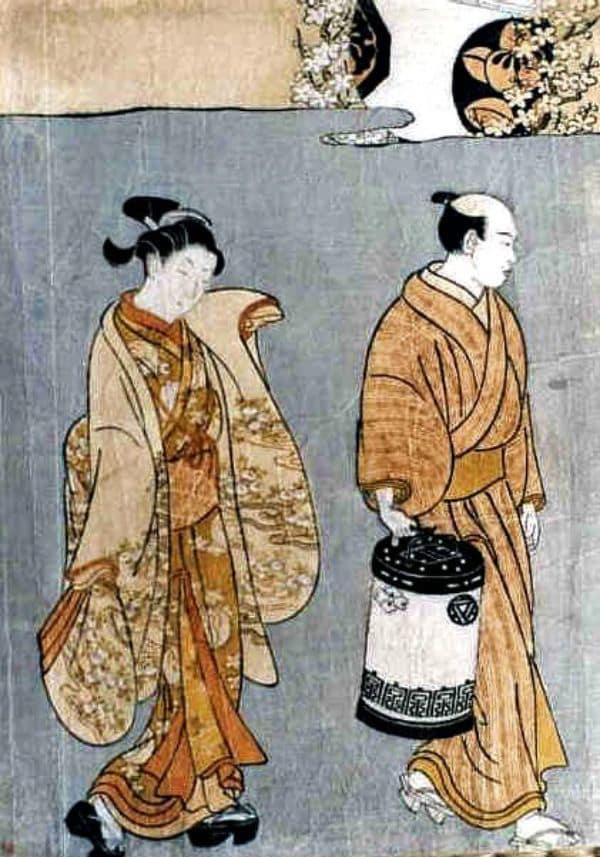 鈴木春信「色子の送り」(18世紀)。江戸時代、セックスワーク専門の少年を「色子」といった。付き添いの男とともに、仕事先に向かう色子の姿は、当時の娘と変わらない。