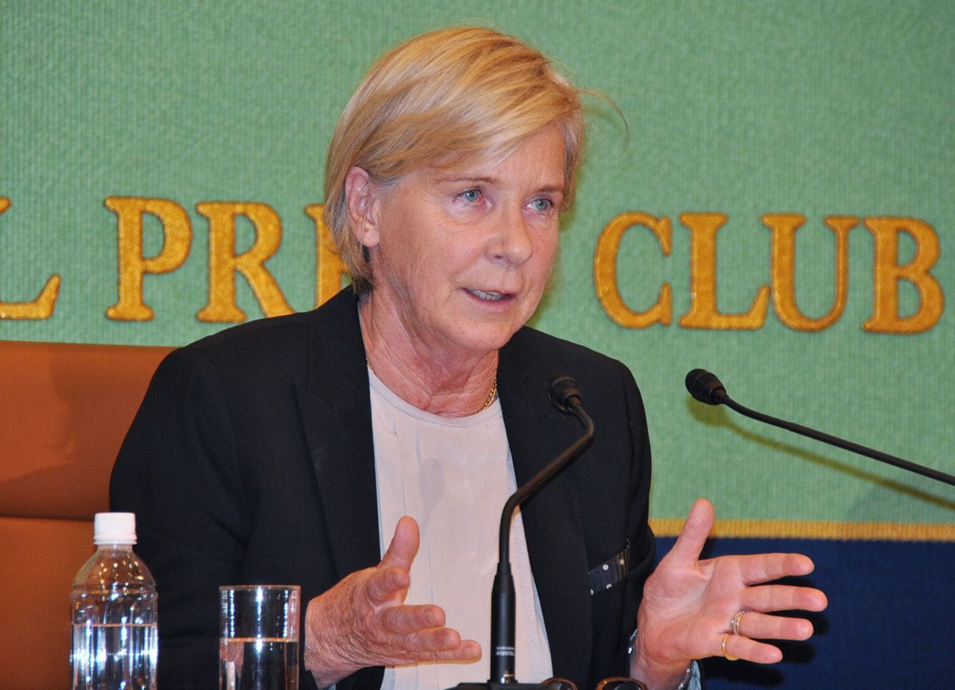 児童ポルノ問題などの視察で来日し、記者会見する国連特別報告者の人権専門家マオド・ド・ブーア・ブキッキオ氏=2015年10月26日、東京・内幸町の日本記者クラブ
