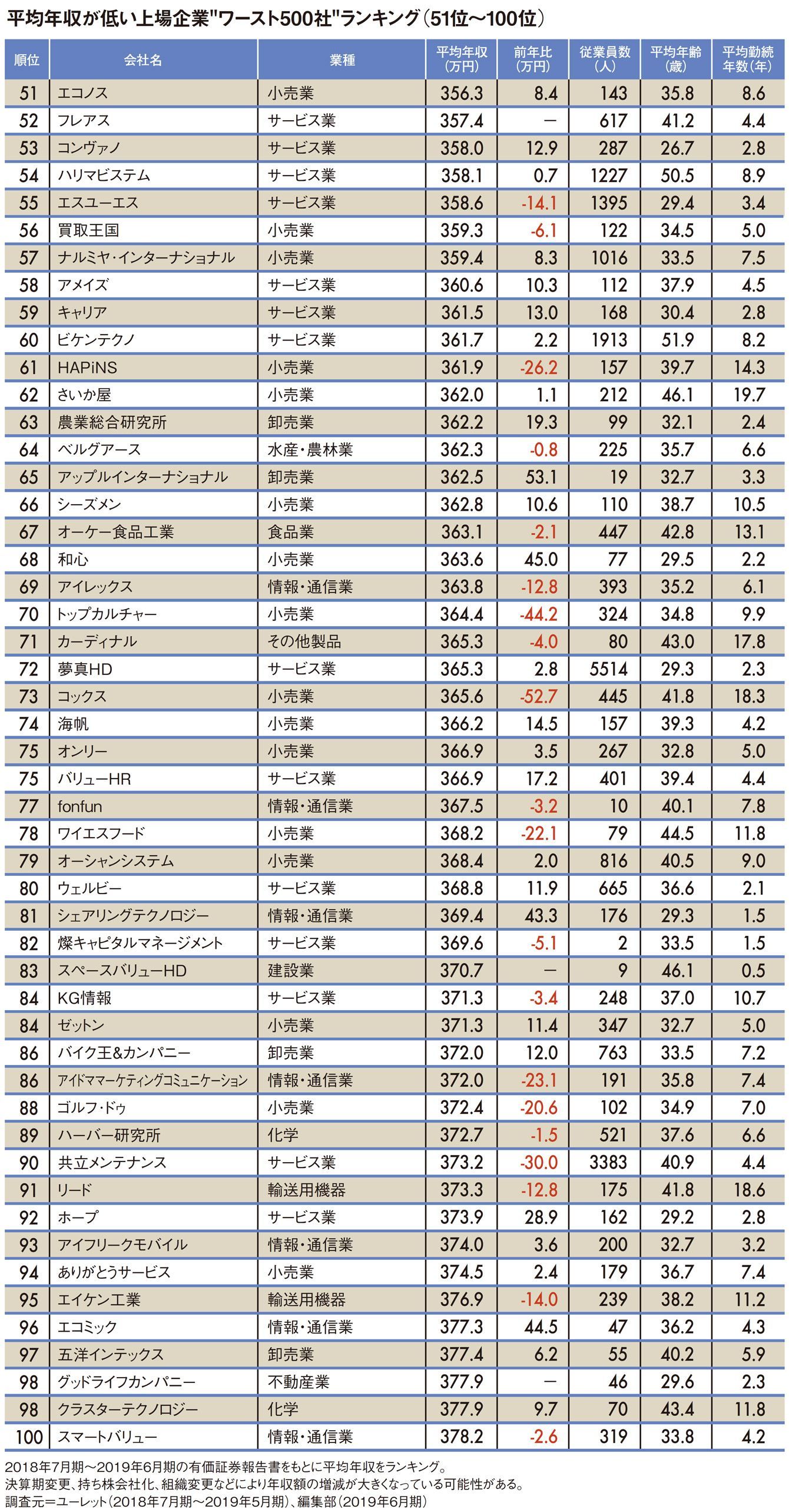 平均年収が低いワースト500社ランキング2019