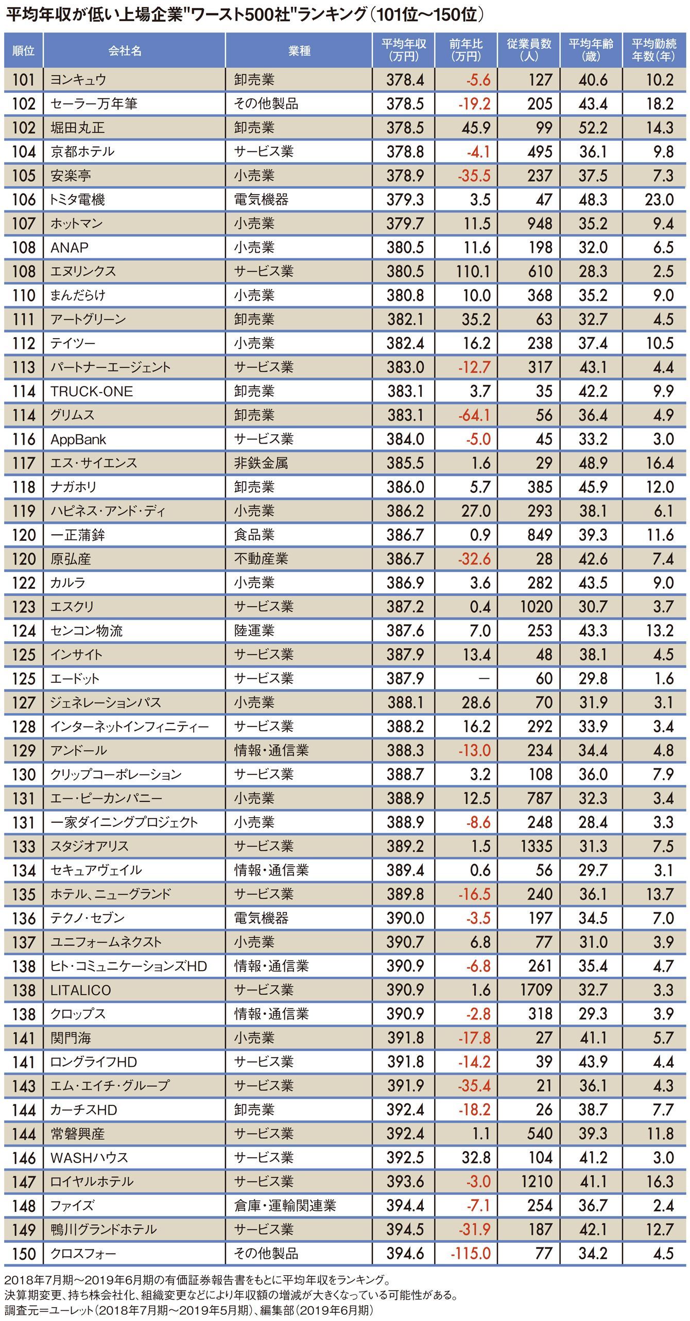 平均年収が低いワースト500社ランキング2019